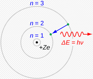 氢原子的玻尔模型。一个带负电的电子被限制在原子轨道上绕着一个体积非常小的带正电的原子核转动。电子在轨道间跃迁时会放出或吸收一定量的电磁辐射。