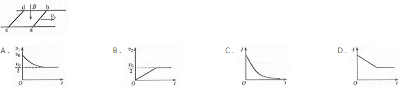 1、(2019全国III,19)(多选)如图,方向竖直向下的匀强磁场中有两根位于同一水平面内的足够长的平行金属导轨,两相同的光滑导体棒ab、cd静止在导轨上。t=0时,棒ab以初速度v0向右滑动。运动过程中,ab、cd始终与导轨垂直并接触良好,两者速度分别用v1、v2表示,回路中的电流用I表示。下列图像中可能正确的是( )