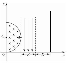 如图所示,xOy坐标系的第一象限内,有一以O1(0,R)为圆心、R为半径的半圆,半圆区域内存在垂直纸面向里的匀强磁场,磁感应强度为B。在它的右侧有一宽度为R、左边界与磁场区域圆相切于A点的匀强电场,电场强度大小为E,方向沿y轴负方向,电场左右边界都平行于y轴。在电场右边相距R处有一垂直x坐标轴、足够长的荧光屏,电子打中荧光屏会发光。现在坐标原点O处向xOy平面内各个方向以相同的速率发射质量为m、电量为e的电子,其中沿y轴正方向射人的电子刚好从电磁场交接点A处飞出磁场进人电场。求: